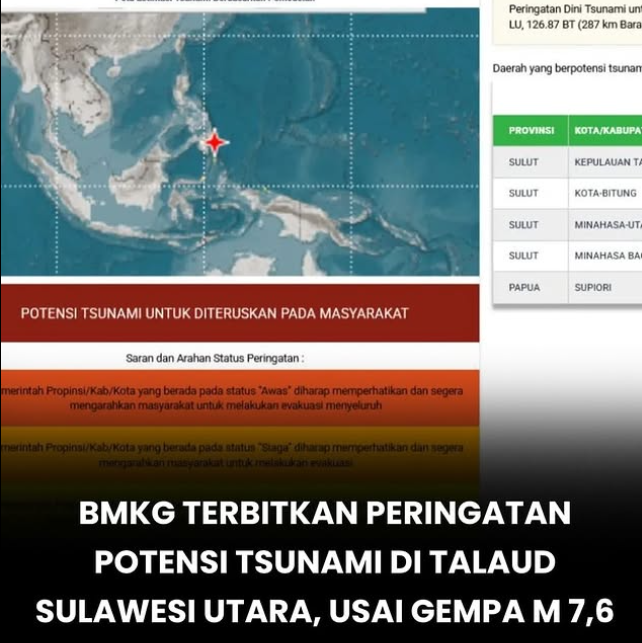 Badan Meteorologi, Klimatologi, dan Geofisika (BMKG) mengeluarkan peringatan dini potensi tsunami di sejumlah wilayah Indonesia bagian timur, khususnya Kepulauan Talaud, Sulawesi Utara, setelah gempa bumi tektonik berkekuatan magnitudo 7,6 mengguncang wilayah Laut Filipina, Jumat (10/10). Direktur Gempabumi dan Tsunami BMKG, Daryono, dalam keterangan di Jakarta menjelaskan bahwa episenter gempa terletak pada koordinat 7,23° Lintang Utara dan 126,83° Bujur Timur, atau sekitar 275 kilometer barat laut Pulau Karatung, Sulawesi Utara, dengan kedalaman sekitar 58 kilometer. “Gempa ini merupakan jenis gempa dangkal akibat aktivitas subduksi dengan mekanisme pergerakan naik (thrust fault),” ujarnya. Getaran kuat dirasakan di sejumlah daerah di Sulawesi Utara dan sebagian wilayah timur Indonesia, menyebabkan masyarakat di beberapa daerah pesisir bergegas menuju tempat yang lebih tinggi.